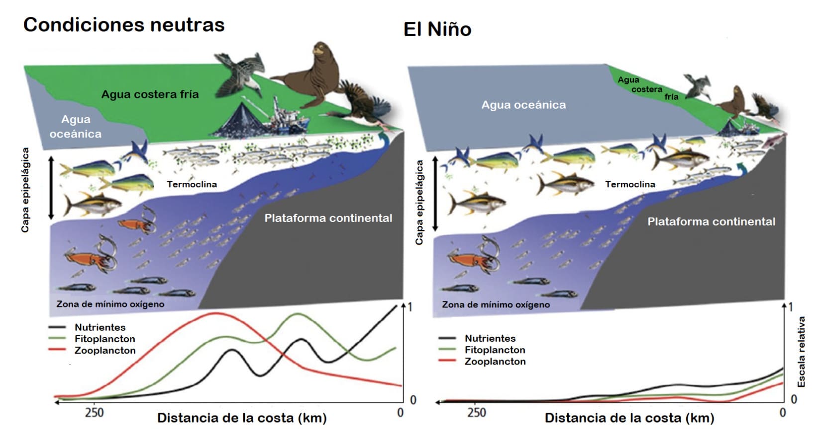 En años normales, el ecosistema costero presenta alta biomasa y productividad primaria debido a eventos de afloramiento que aportan nutrientes, dominando fitoplancton (e.g. diatomeas) y zooplancton (e.g. eufáusidos) de gran tamaño y peces pelágicos (e.g. anchoveta), el cual se extiende hasta más de 200 km de la costa. Los impactos de El Niño reducen dramáticamente la extensión productiva del ecosistema costero, acercándose el ecosistema oceánico a la costa, con baja producción primaria y pocos nutrientes, dominando fitoplancton (e.g. microflagelados) y zooplancton pequeño (e.g. copépodos) (modificado de Chávez 2002).
