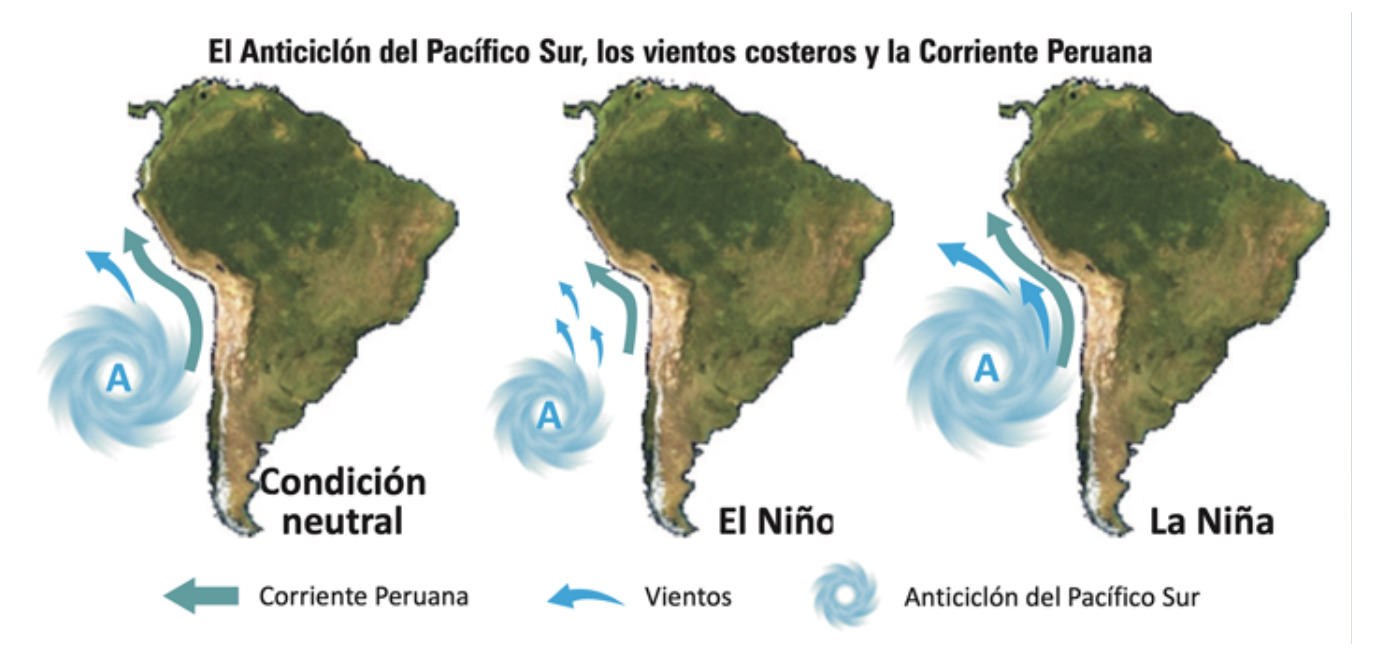 Durante El Niño, el Anticiclón del Pacífico Sur (APS)y los vientos alisios del sudeste, así como los vientos costeros, experimentan modificaciones significativas que impactan el clima de la región. El APS tiende a mostrarse debilitado y desplazado hacia el sur , reduciendo la fuerza de los vientos alisios del sudeste. Como resultado, las aguas cálidas del océano Pacífico central y oriental se expanden hacia la costa de Perú y Ecuador, aumentando la temperatura del mar y alterando los patrones de precipitación.
