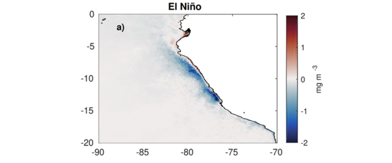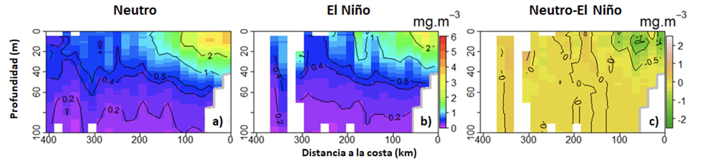 Durante El Niño, la oxiclina y la Zona de Mínima de Oxígeno (ZMO) se profundizan más allá de lo habitual, debido a cambios en la circulación y al efecto de las ondas Kelvin de hundimiento (Graco et al., 2007; Gutiérrez et al., 2008; Espinoza-Morriberón et al., 2019). Esto se encuentra asociado también a la profundización de la nutriclina, ocasionando una reducción de los nutrientes en la capa superficial, lo cual a su vez desencadena una reducción de la productividad primaria, principalmente de la biomasa de diatomeas (Calienes et al., 1985; Graco et al., 2007; Espinoza-Morriberón et al., 2017). Asimismo, el pH en la capa superficial tiende a incrementarse (León et al., 2011).