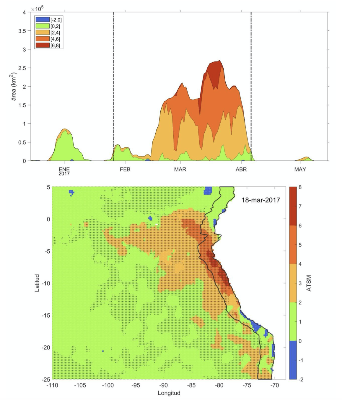 Serie de tiempo del área (km2) de la ola de calor marina (OCM) asociada a ENC 2017. El área se presenta segmentada por rangos de anomalía de temperatura superficial del mar (ATSM) hasta + 8°C para la zona entre los 4° S y 15° S, dentro de las 150 mn costeras desde el 15 de diciembre del 2016 al 15 de mayo del 2017; b) Distribución espacial de la ATSM entre los 5° N y 25° S, 70° W y 110° W el 18 de marzo del 2017, fecha de máxima cobertura de los valores de ATSM mayores o iguales a +6 °C. La cobertura de la OCM se indica con puntos negros. Fuente: OISST 2.1.