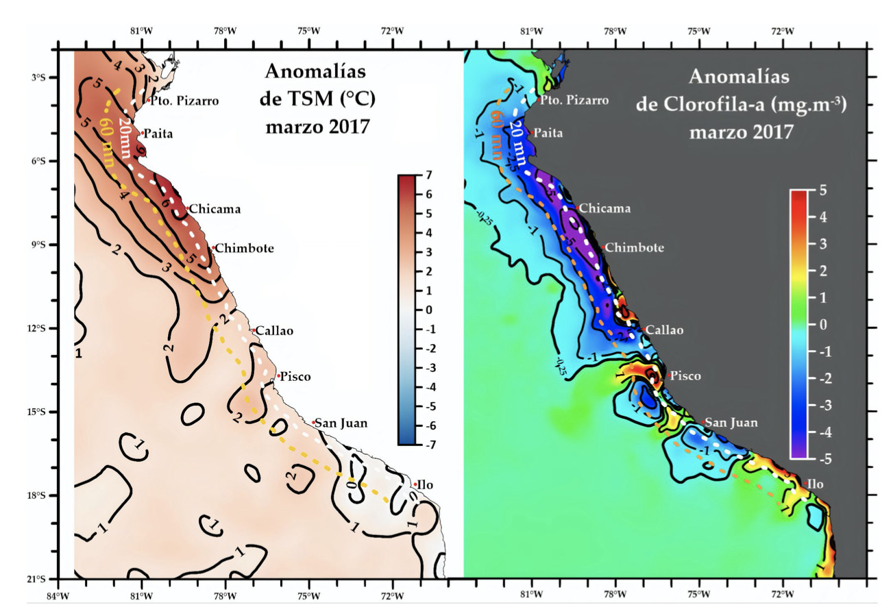 Durante ENC 2017, el colapso de los vientos costeros del sureste y del afloramiento costero (Echevin et al., 2018; Espinoza-Morriberon et al., 2021), así como el aumento de la estratificación térmica (Quispe et al., 2021), provocaron una aguda reducción de la productividad frente a la costa centro-norte (Ledesma et al., 2021).