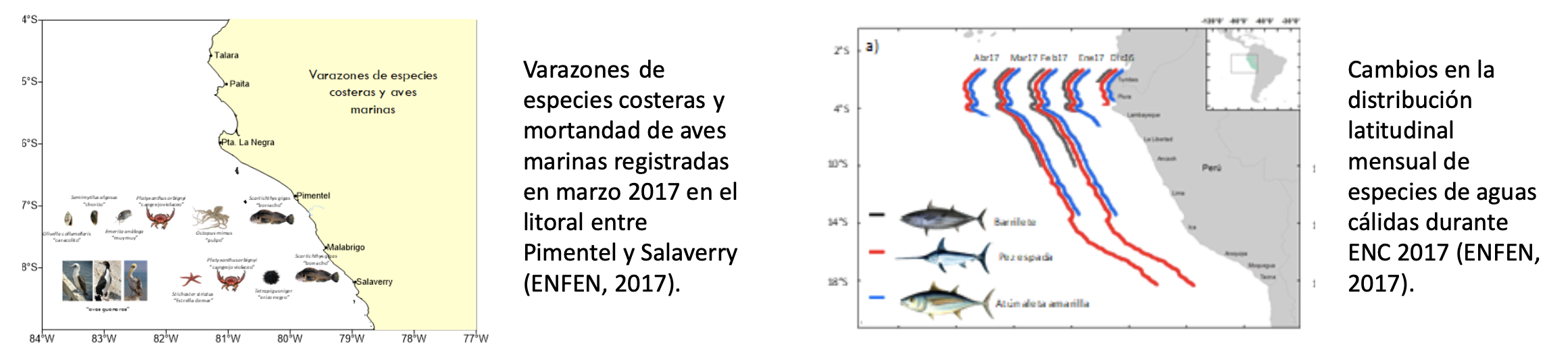 Asimismo, ocasionó la migración hacia la costa y hacia el sur de peces de aguas cálidas, así como el desplazamiento de la anchoveta hacia la costa entre Chicama y Pisco, lo cual ocasionó mortandades masivas de sus depredadores naturales en la costa norte. Sin embargo, dada la corta duración del evento (seis meses), el evento no generó impactos significativos sobre la biomasa de la anchoveta (ENFEN, 2017; Gutiérrez & Bouchon, 2021).